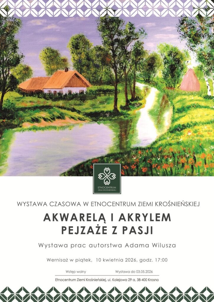 Już w kwietniu w Galerii wystaw czasowych Etnocentrum Ziemi Krośnieńskiej w Krośnie zaprezentowana zostanie wystawa prac Adama Wilusza zatytułowana „Akwarelą i akrylem – pejzaże z pasji”. Ekspozycja obejmie obrazy inspirowane naturą, wykonane w dwóch technikach malarskich, a odwiedzający będą mogli oglądać ją od 10 kwietnia do 3 maja 2026 roku.