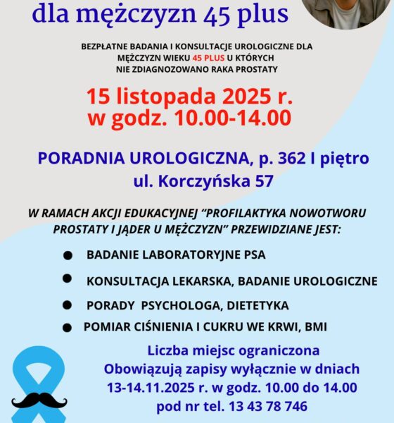 Wojewódzki Szpital Podkarpacki im. Jana Pawła II w Krośnie zaprasza mężczyzn w wieku 45+ do wzięcia udziału w akcji edukacyjno-profilaktycznej dotyczącej nowotworów prostaty i jąder. „Biała sobota” odbędzie się 15 listopada w godz. 10-14. Zapisy przyjmowane są 13–14 listopada 2025 r. w godz. 10.00–14.00 pod numerem telefonu 13 43 78