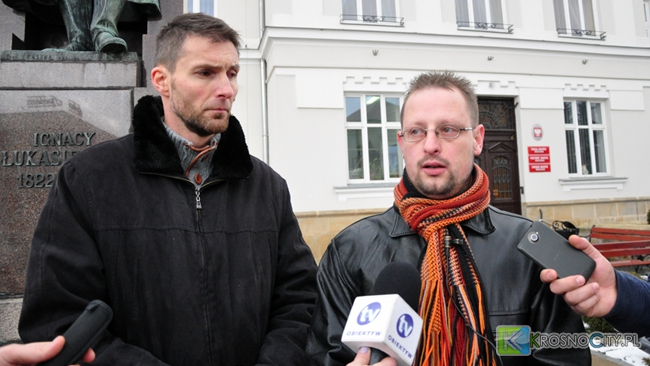 Na zdjęciu ilustracyjnym: Rafał Woźniak i Piotr Dymiński podczas briefingu prasowego w 2015 roku, dotyczącego zmagań o dostęp do rejestru umów UM Krosna.