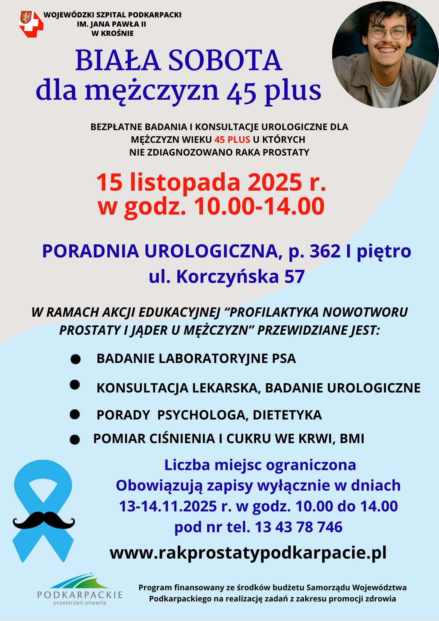 Wojewódzki Szpital Podkarpacki im. Jana Pawła II w Krośnie zaprasza mężczyzn w wieku 45+ do wzięcia udziału w akcji edukacyjno-profilaktycznej dotyczącej nowotworów prostaty i jąder. „Biała sobota” odbędzie się 15 listopada w godz. 10-14. Zapisy przyjmowane są 13–14 listopada 2025 r. w godz. 10.00–14.00 pod numerem telefonu 13 43 78 746.