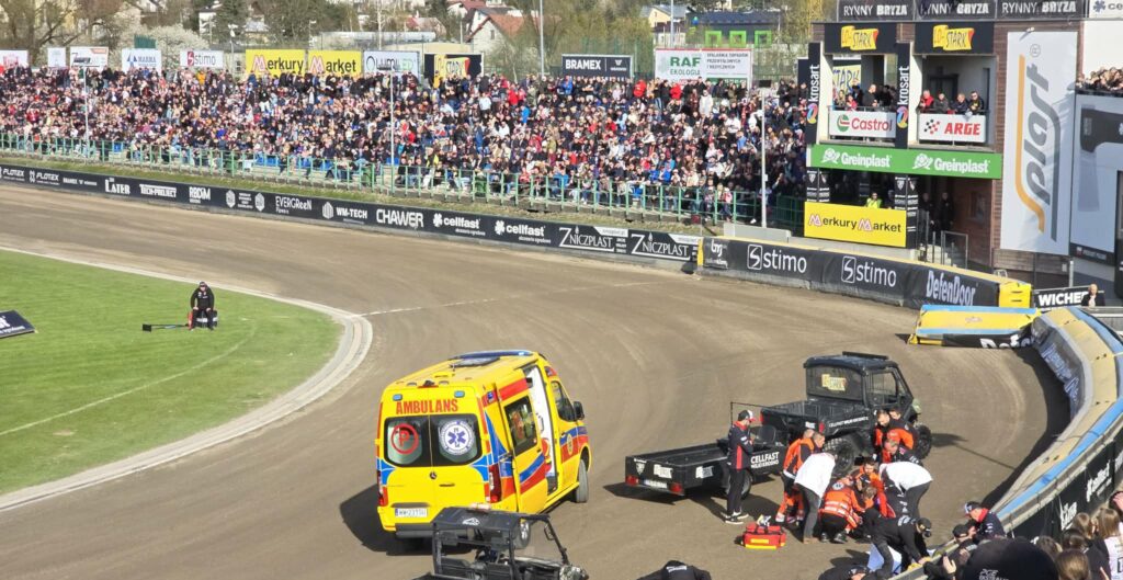 Dużo emocji przyniósł także groźnie wyglądający wypadek na torze. Do zdarzenia doszło po kontakcie między zawodnikami. Paweł Sitek (Moofin Ostrów) stracił panowanie nad motocyklem i z dużą siłą uderzył w bandę. Bieg został natychmiast przerwany, na tor wjechały służby medyczne, a cała sytuacja wywołała wyraźne poruszenie na stadionie. Po ocenie zdarzenia sędzia zdecydował, że to był faul w wykonaniu Roberta Chmiela oraz o ukaraniu tego zawodnika „Wilków” żółtą kartką i wykluczeniu go z powtórki biegu, co dodatkowo utrudniło gospodarzom walkę o korzystny wynik.